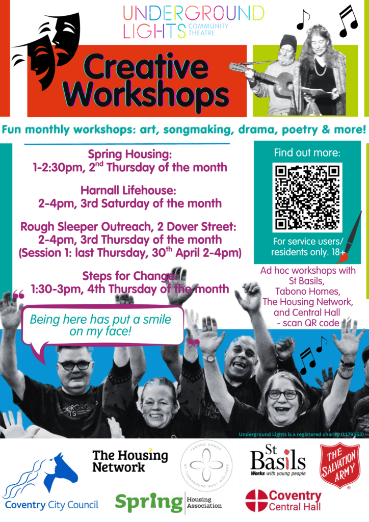 Each session will focus on a mix of creative activities and confidence-building exercises – these will be co-designed by the attendees. Workshops may include art, drama, poetry, music, song making and more!